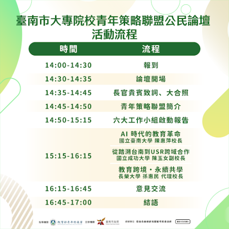臺南市政府積極推動青年政策,透過跨局處與大專校院協作,啟動「青年策略聯盟」,規劃教育課程、就業創業、運動產業、公共參與、國際交流及政策協力六大工作小組,串聯市府與14所大專院校共同打造產官學合作網絡。 ...更多