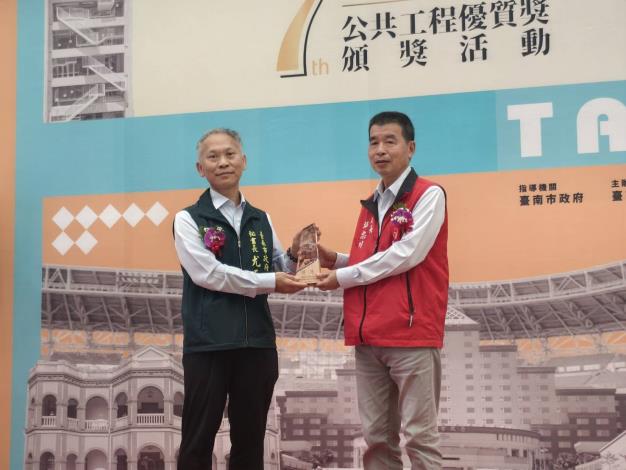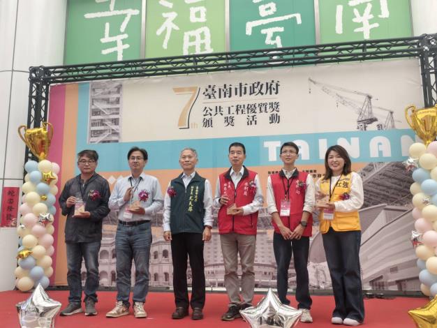 臺南市政府第7屆公共工程優質獎22日舉行頒獎典禮,今年由各機關擇優推薦40件工程參選,評審結果共25件工程獲獎,包括特優4件、優等9件及佳作12件,分別由地政局、觀光旅遊局、北區區公所、將軍區公所、白河區公所、交通局、水利局、漁港及近海管理所、教育局(沙崙高級中等學校新設校籌備處、蓮潭國民中小學、新市幼兒園)及工務局等12機關獲獎。秘書長尤天厚頒獎時,期勉市府團隊再接再勵,好還要更好,透過優質的公共工程,打造幸福宜居大台南。也期許透過良性競爭,提升市府公共工程品質,工程團隊更精進施工技術,與環境結合,讓市民享有安全,舒適,貼心,永續的公共設施。