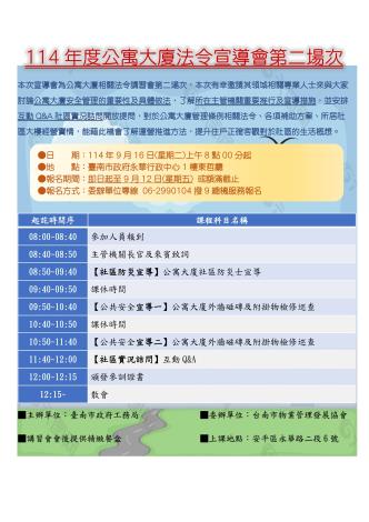 本次宣導會,著重於社區公共安全、防災思維及實務運作,旨在提升正確公共安全觀念並宣導現行公寓大廈管理法令與政策。本次邀請本市消防局及建築工程專業人士講授「公寓大廈防災士宣導」、「外牆磁磚及附掛物檢修巡查」及「開放Q&A」,促進市民朋友對公寓大廈管理條例、補助方案及實務交流的了解,協助社區管理運作與安全維護更加順暢。參加者可獲精美餐盒及本局贈送的社區管理宣導字卡,機會難得,敬請踴躍參加!